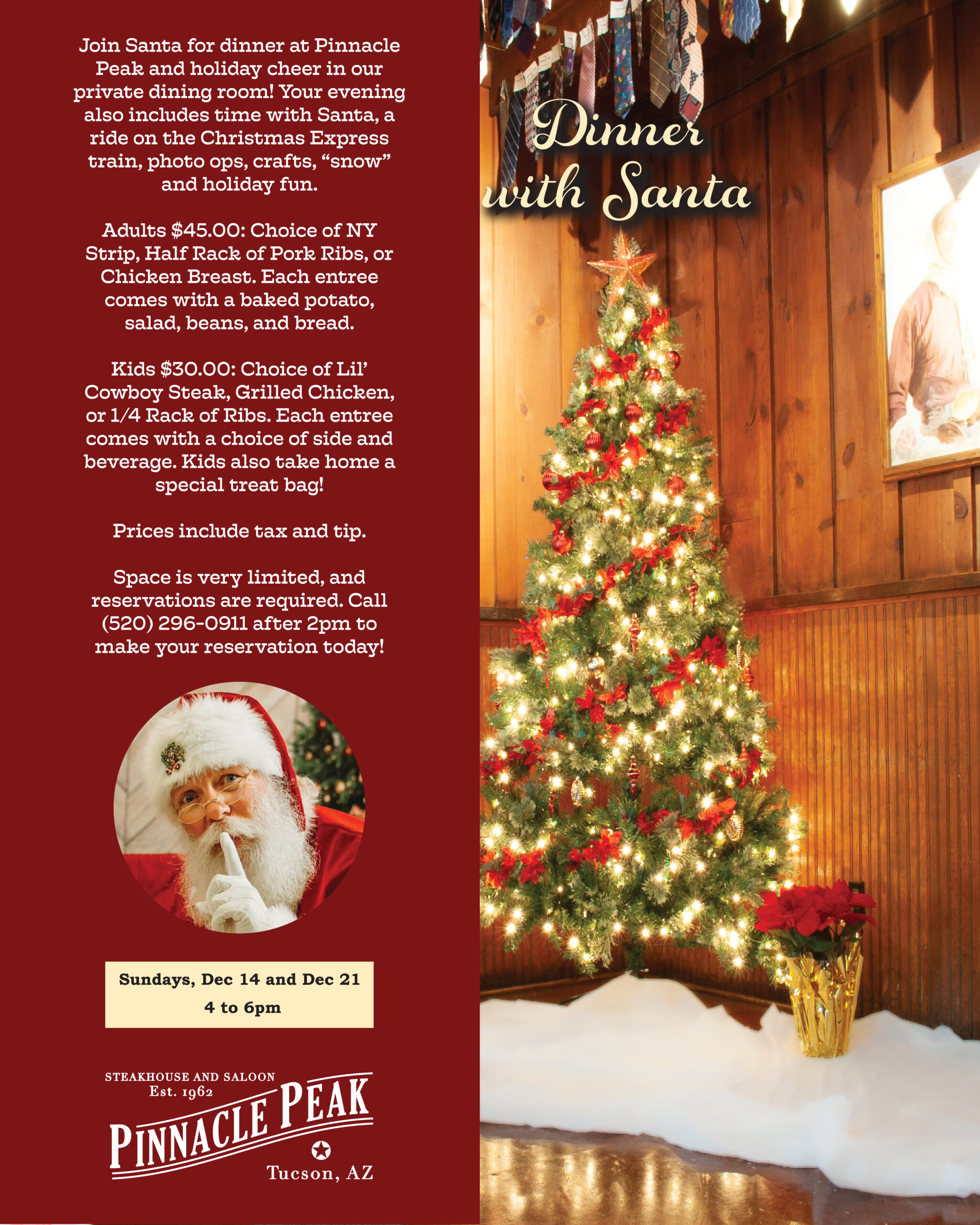 For over 60 years, Pinnacle Peak Steakhouse has served the good people of Tucson. Locally owned and operated, Pinnacle Peak takes great pride in serving real Western food in an authentic Old West atmosphere. Opening in 1962, Pinnacle Peak became famous for good food and good fun. Guests were encouraged to relax and enjoy a hearty steak dinner. The “No Ties Allowed” policy has always been a part of the Pinnacle Peak mentality.