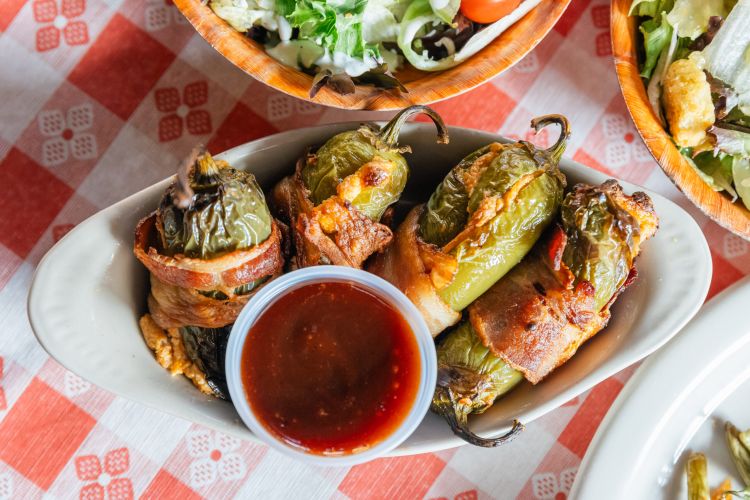 Bacon wrapped and grilled jalapeños stuffed with cream cheese, cheddar cheese, and spices. Served with prickly pear BBQ sauce.