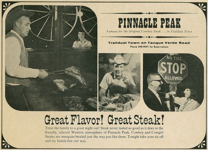 For over 60 years, Pinnacle Peak Steakhouse has served the good people of Tucson. Locally owned and operated, Pinnacle Peak takes great pride in serving real Western food in an authentic Old West atmosphere.